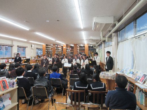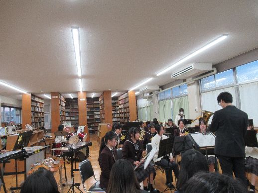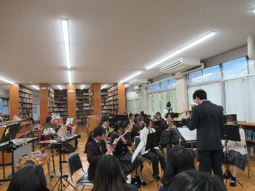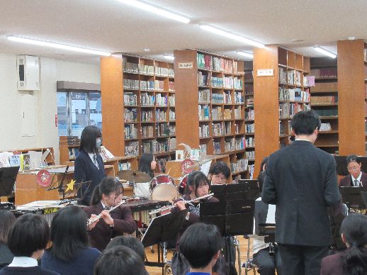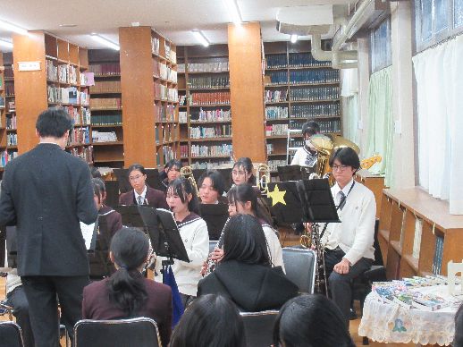 お知らせ/学校生活/山高ギャラリー 【山高ギャラリー】クリスマスコンサートの風景 2025年12月9日 12月9日火曜日、図書館で吹奏楽部によるクリスマスコンサートが行われました。 部員たちは心をひとつにした演奏を披露し、会場に集まった生徒や先生方を美しい音色で包み込みました。